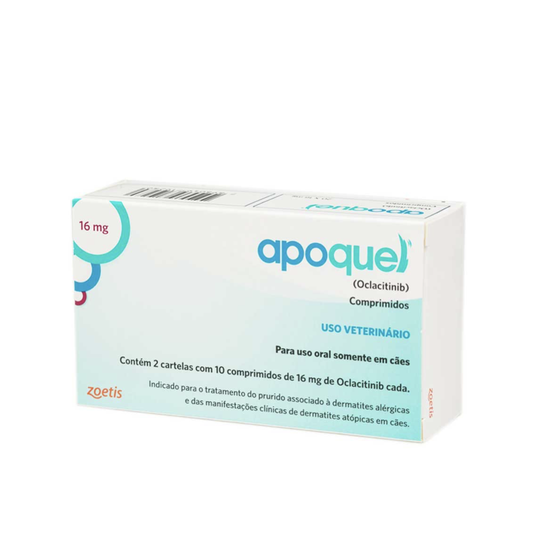<p>O Apoquel Dermatológico para Cães 20 comprimidos, vai trazer alivio imediato da coceira e tranquilidade para seu animal. É a revolução no tratamento da coceira relacionadas às dermatites alérgicas e dermatite atópica, tem efeito rápido, diminui a coceira em 04 horas. Seguro e eficaz até mesmo nos tratamentos prolongados, e o melhor sem os indesejáveis efeitos da ciclosporina e dos corticosteroides. Esse medicamento melhora a qualidade de vida do pet, assim que iniciam o tratamento os cães passam a dormir melhor e ficam mais relaxados e contentes. O Oclacitinib inibe a atividade de uma variedade de citocinas pruridogênicas e pró-inflamatórias, assim como de citocinas envolvidas em alergias e que dependem da atividade das enzimas JAK1 ou JAK3. Exerce pouco efeito nas citocinas envolvidas na hematopoiese e que são dependentes das enzimas JAK2. O Oclacitinib não é um corticosteroide ou um antistamínico.</p>