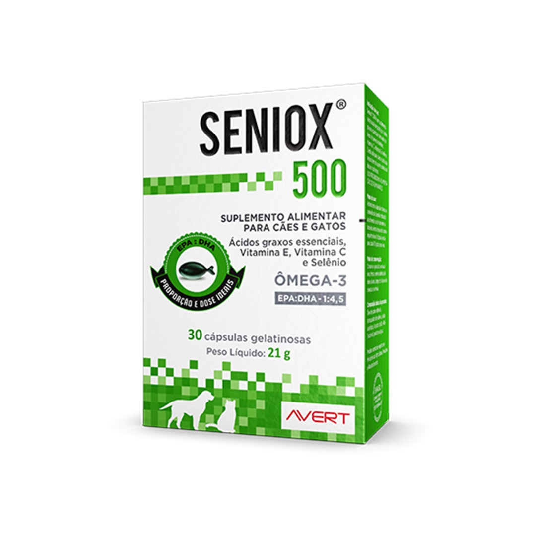 <p>SENIOX 500 é um suplemento alimentar composto por ácidos graxos essenciais derivados de óleos de peixes marinhos, vitamina C, vitamina E e selênio. É indicado para cães e gatos que necessitem do aporte.</p>